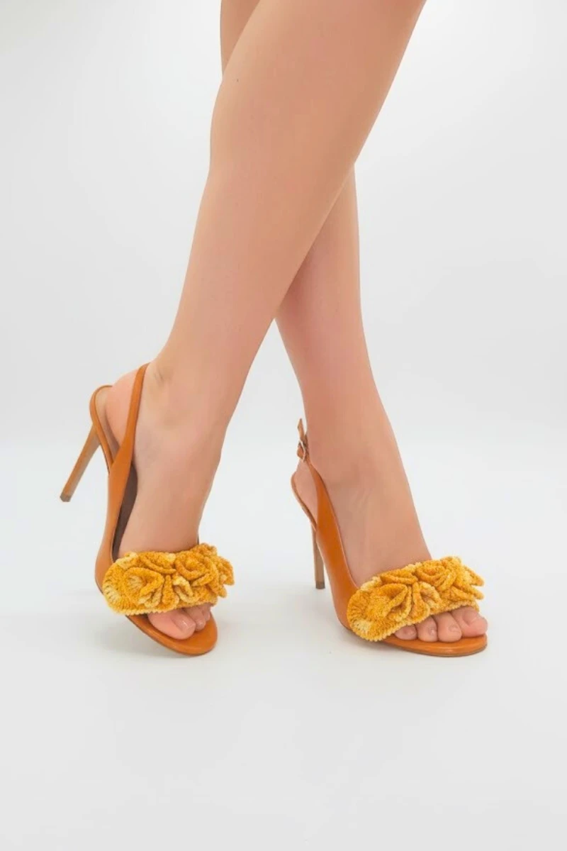 La slingback PALERMO è realizzata in morbida pelle color cuoio e arricchita da un fiore crochet giallo fatto a mano, un dettaglio romantico che rende ogni paio unico. La struttura open toe slancia la linea del piede con naturalezza, mentre il cinturino regolabile assicura una calzata stabile e confortevole.